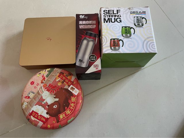 5. 全新保溫杯、全新自動攪拌杯、餅乾鐵盒2個
