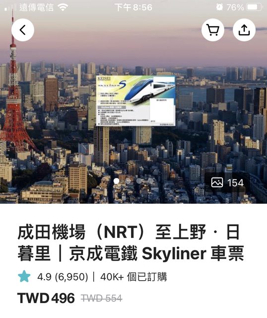 KKDAY購入 單程skyliner+24hr 套票=633/組