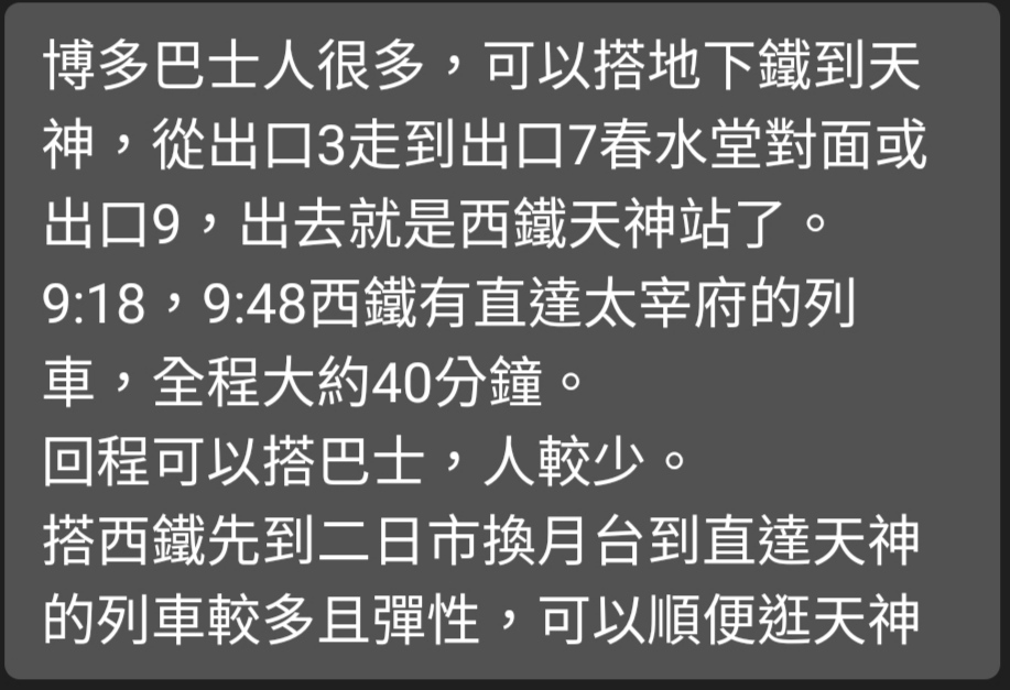 推 neil1014153 : 個人感覺太宰府巴士比較方便喔 06/28 00:00