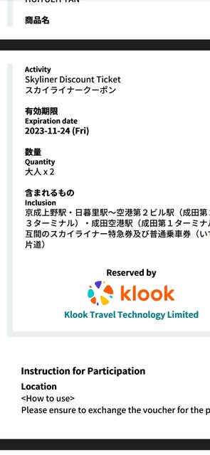 此為klook 電子憑證截圖,購買後會發送完整檔案,在京成電鐵掃描QR 碼使用,2023/11
