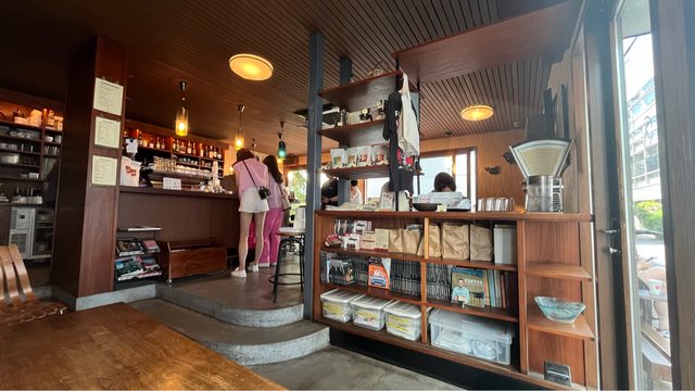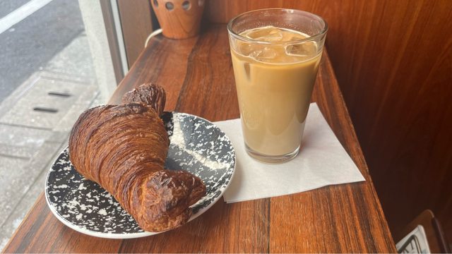 可頌很酥脆、香氣夠,咖啡則是偏酸的調性,還滿多韓國人在這裡的。