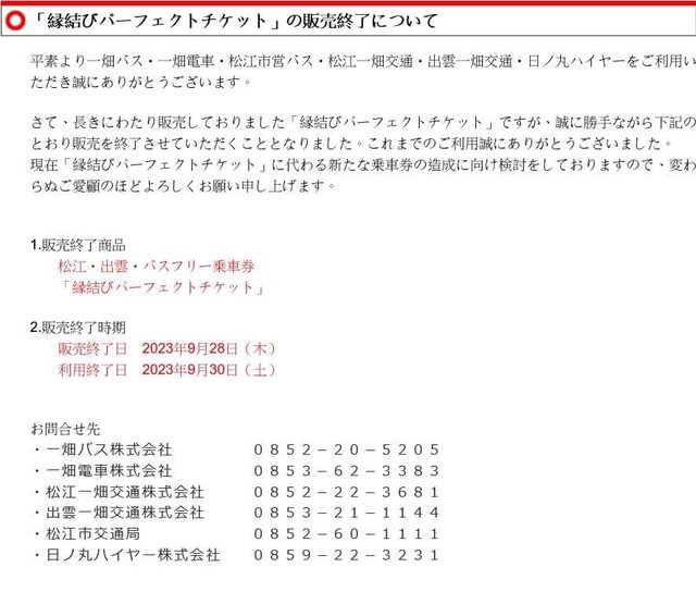 縁結びパーフェクトチケット(結緣完美車票)將在9月28日停售,30日停止使用。