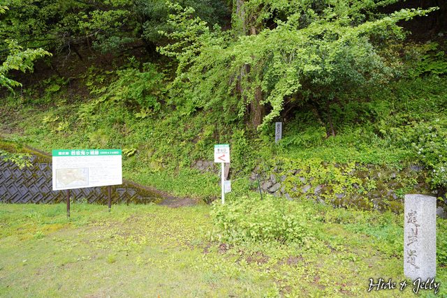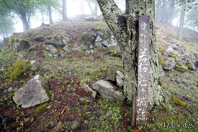不遠處的樹幹旁倚靠著木製的「史跡 若桜鬼ヶ城」碑,這可能是一代目的城碑,被石碑