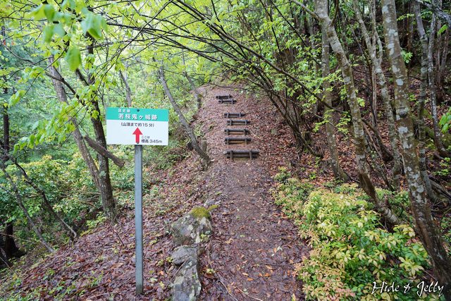 再往上爬10分鐘,出現了山頂還有15分鐘的路標,此處標高已345公尺,距離山頂還有約