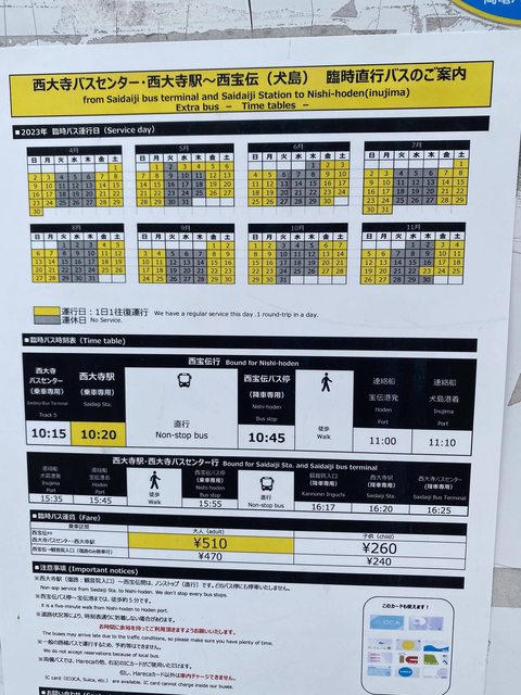 回程:15:35船班往寶傳港-步行到巴士站牌-15:55巴士往西大寺-16:36赤穗線回岡山