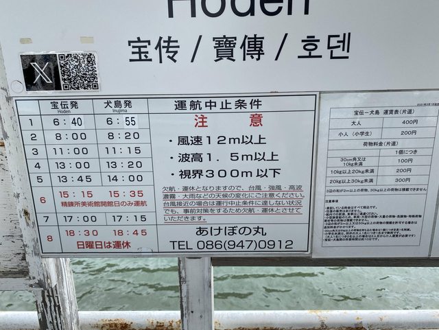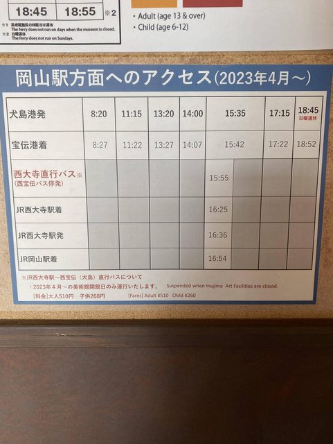 去程:9:25赤穗線往西大寺-10:20巴士往西寶傳-步行五分鐘到寶傳港-11:00船班往犬島