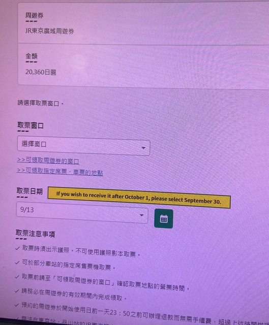 → hl73254254 : 必須選"輸入周遊券使用人數・開始日期",取票日跟09/13 13:24
