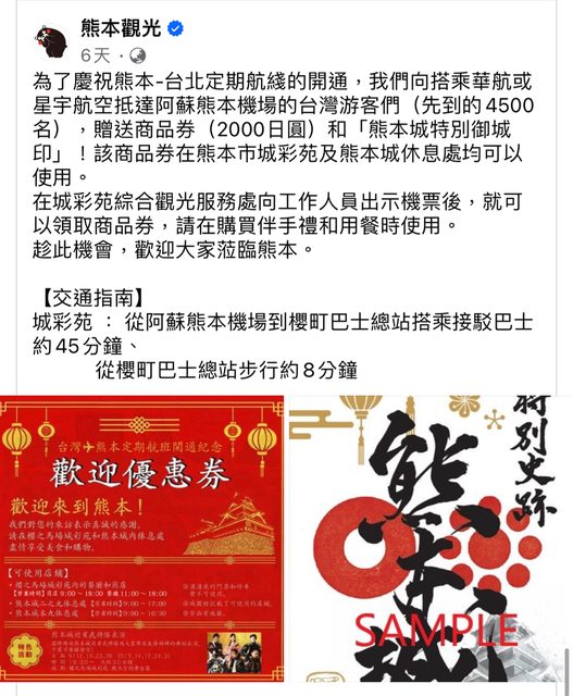 標題[資訊] 台灣直飛熊本航班領取現金券