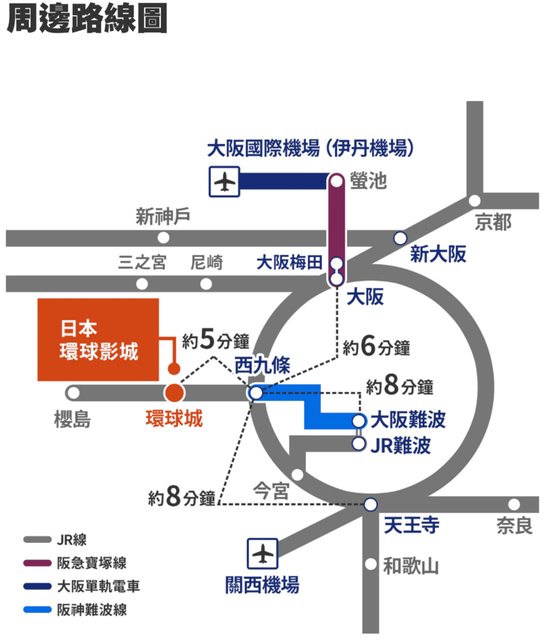 鄰近景點:環球影城園區(約 700 公尺)、大阪海遊館(約 1.8 公里)、梅田空中庭園