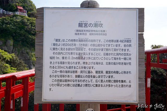 鳥居一旁立著一塊牌子,寫著「龍宮の潮吹」,原來一旁有個1m*0.2m的海蝕洞,經過海