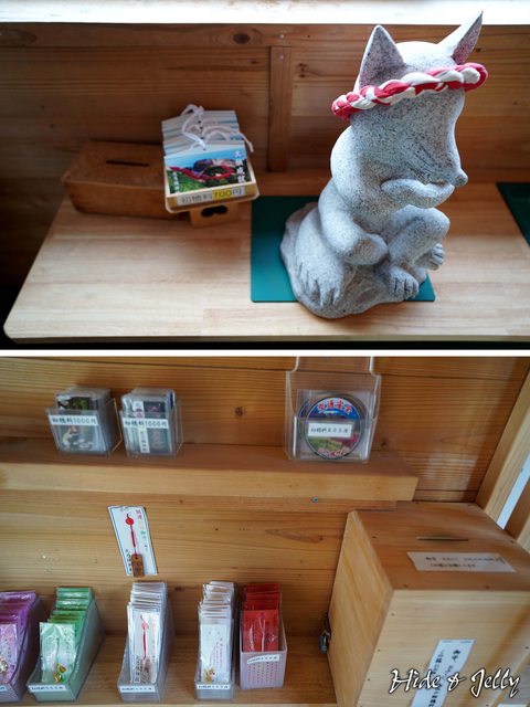 鳥居一旁有一棟無人販賣所,裡面有神社的御守與繪馬,收錢的是隻手抱胸的石狐,拿了