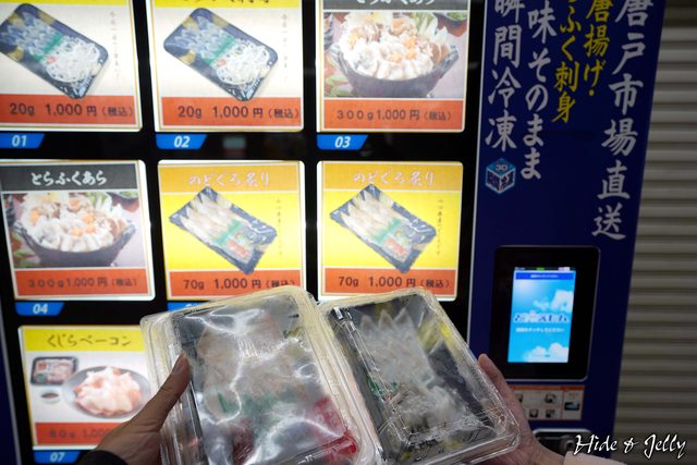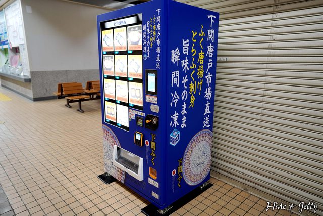 角島大橋的時間。下関駅中也有有趣的事物,就是這個販賣下関河豚的自動販賣機。