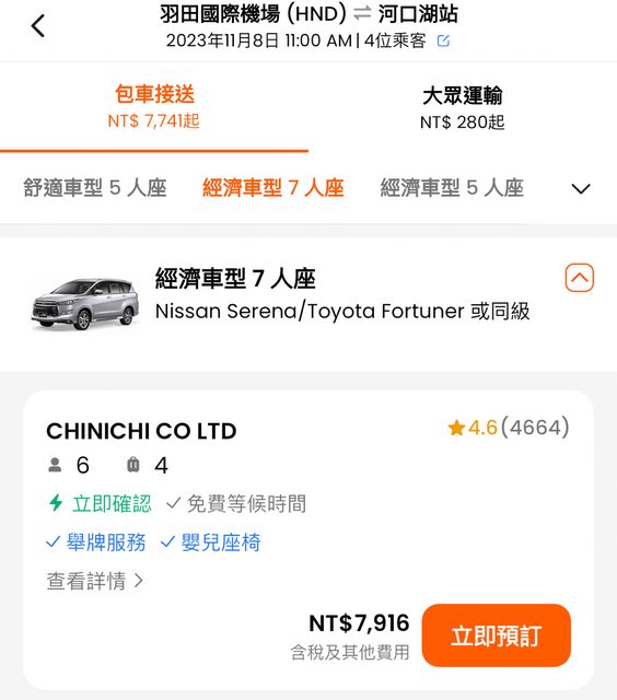 1. 預計從Klook訂7人座包車,車資7900。