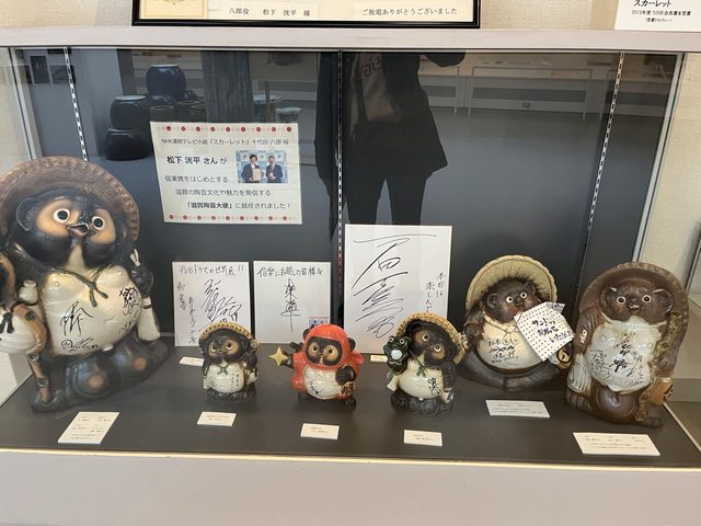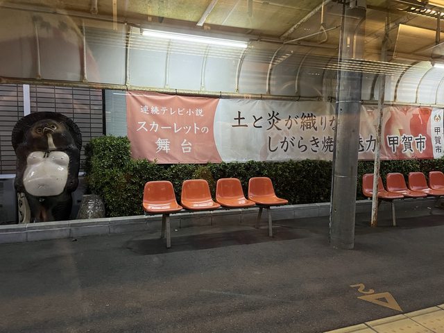 信樂站內一排狸貓夾道歡迎,還掛著大大的布條寫著「スカーレット的舞台」。