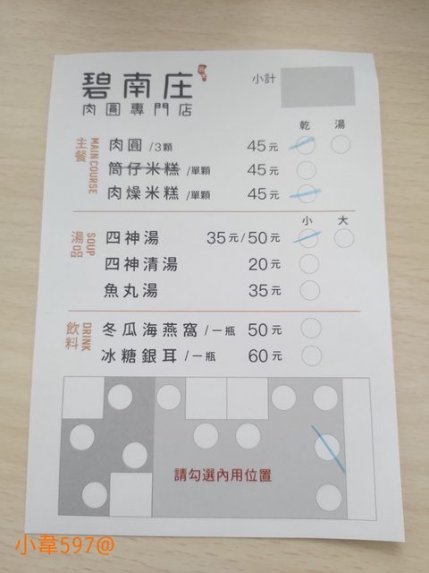 有肉圓(乾/濕),有米糕/有湯/有飲料,填好單子,送到櫃台