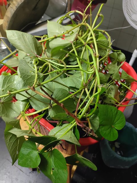因為這幾天雨水充沛,種在盆子的地瓜藤都向外在小小的院子裡爬呀爬呀爬,快擋住路了,