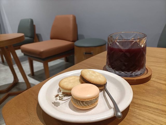 拿到的甜點有馬卡龍、鹹餅乾、乳酪蛋糕