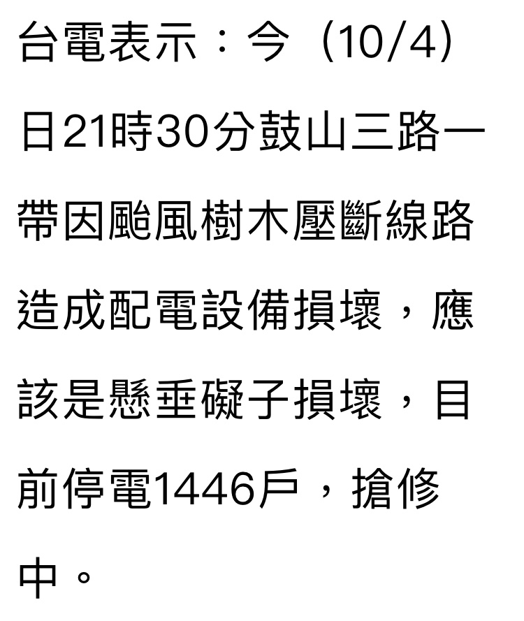 → enjoyyou : 不知道幾點復電了 感謝台電相關人員~ 10/05 04:12