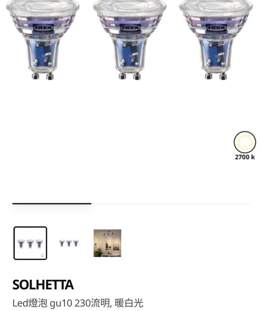 物品名稱:IKEA Led燈泡 gu10 230流明, 暖白光(三入)