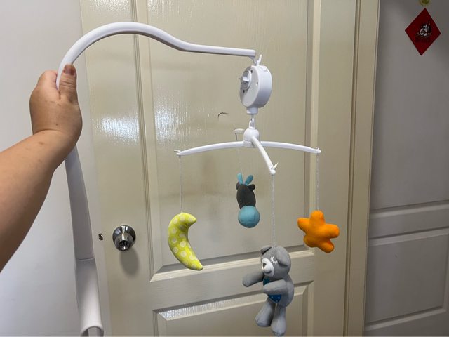 巾、蝴蝶包巾3件、全新手套、手腕鈴、圍兜、床邊音樂鈴、外出嬰兒車置物包、護身符