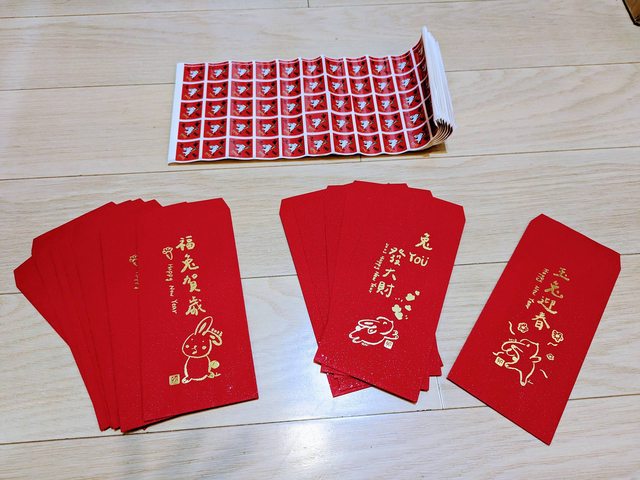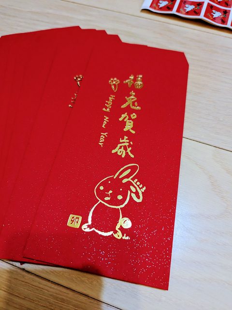 今年沒使用完的燙金兔年紅包袋跟小貼紙多個,全新