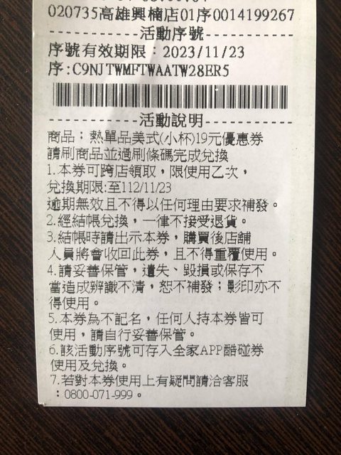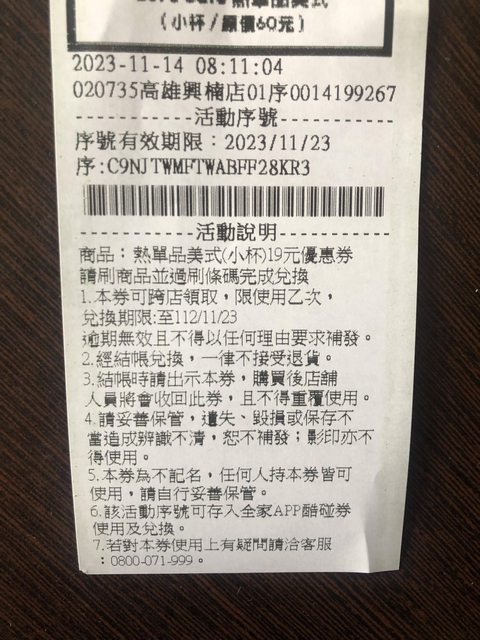 全家小熱美19元券,可存app