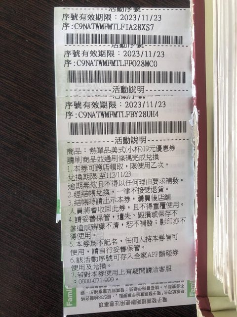 標題[贈送] 全家小熱美19元*3序號