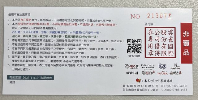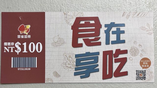 標題[贈送] 雲雀餐飲集團優惠券100元