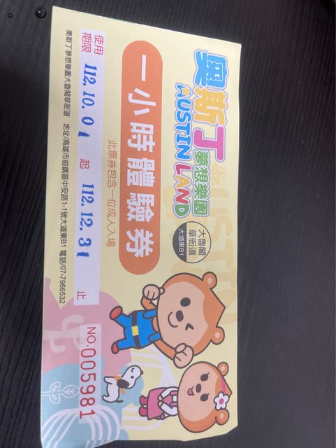 奧斯丁夢想樂園草衙店一大一小1小時體驗券,期限到112.12.31。
