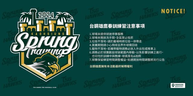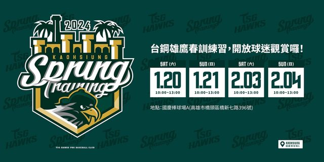 台鋼雄鷹2024年將踏上一軍戰場,1月17日成軍記者會之後,隔天即展開春訓,備戰隊史第一個一軍賽季挑戰!隊史首次踏上一軍前的春訓,基地位於高雄橋頭國慶棒球場,春訓LOGO結合橋頭糖廠建築元素與本壘板獨特形象,象徵球隊以高雄為據點,積極備戰、蓄勢待發