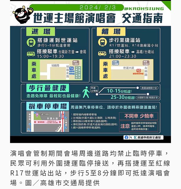 交通局說,世運主場館是目前台灣辦理演唱會可容納最多人數的場地。為維護參加民眾步行