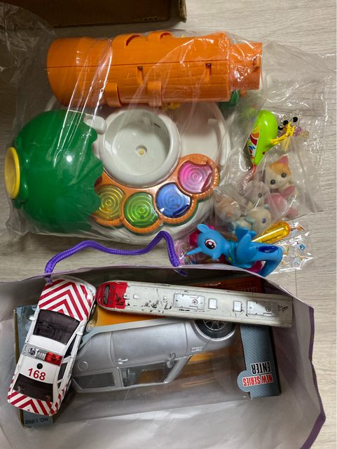 物品狀況:定期淘汰有缺損、有使用痕跡的二手粗玩塑膠、車類等玩具,大約一袋的量,