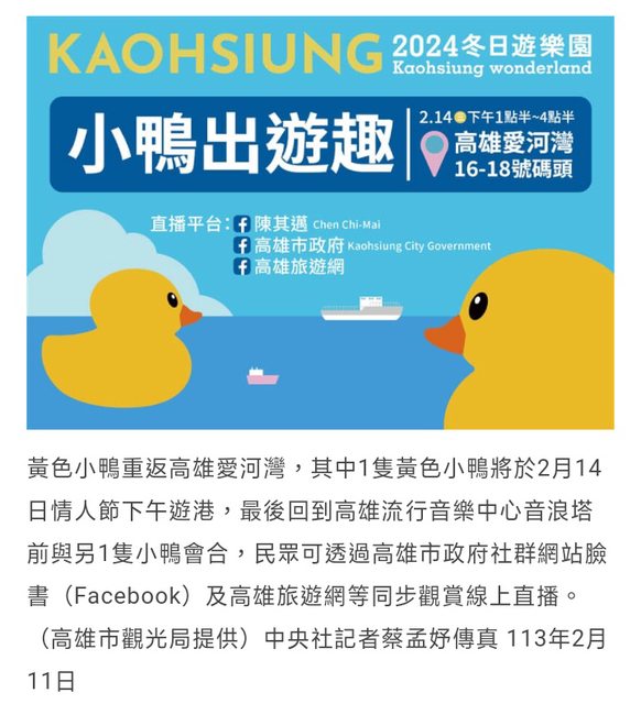 標題[新聞] 高雄黃色小鴨情人節耍浪漫 將上演遊港相遇親吻