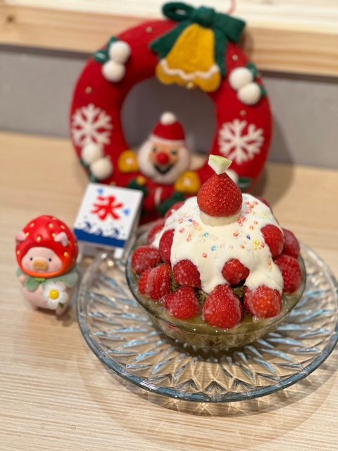 樣子就像是棵聖誕樹,上層是日式的抹茶冰鋪上滿滿的草莓,底層是甜甜的草莓冰,吃完抹茶後再用甜甜的草莓收尾真的很對我胃口! 店家還有附上一杯草莓醬讓我們自己加,聽店家說他們的果醬都是自己用水果去煮的,所以外面是買不到的。