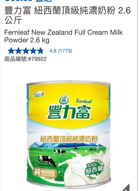 欲換物品:豐力富純濃奶粉2.6公斤 一罐+科克蘭全脂鮮奶1.89公升 一瓶