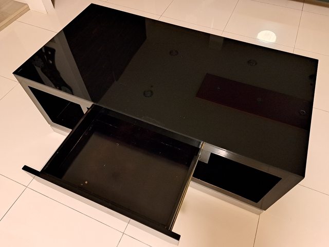 桌面的黑色強化玻璃跟桌子是黏在一起的