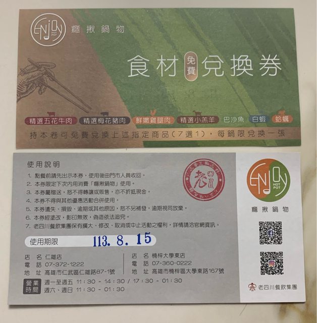 揪癮鍋物食材兌換券*6張、使用期限8/15。