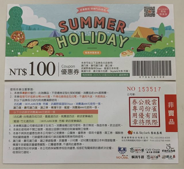雲雀集團折價券*4張