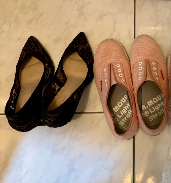 女鞋:24.5,有穿著痕跡,黑色蕾絲是高跟,粉色是平底鞋