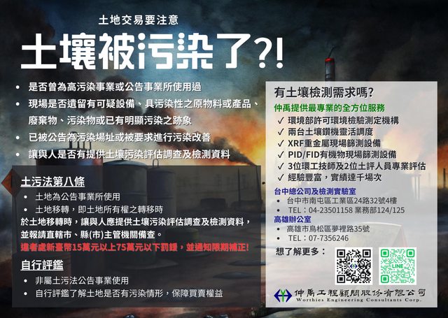 仲禹專門為廠房及土地移轉等土壤污染評估及檢測服務,幫助了解土地現況,更協助客戶避