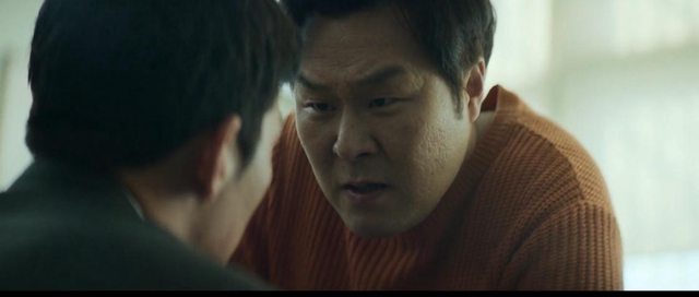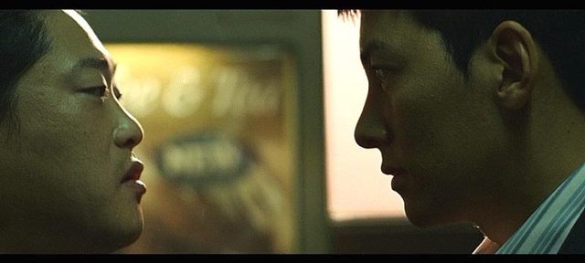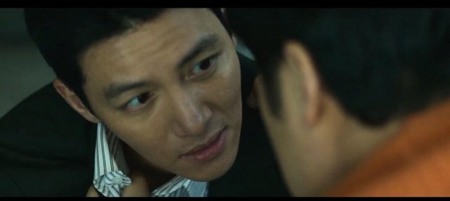 1. 在警局裡透過用從下往上拍攝(低角度)的黃民九(尹京浩)以及從上向下拍攝(高角