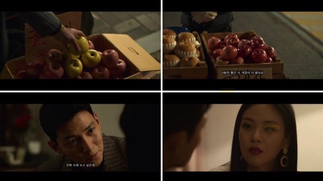 8. 某場景中俊末拿了綠色蘋果,而海蓮卻拿了紅色蘋果;兩人在之前的場景出現時,背