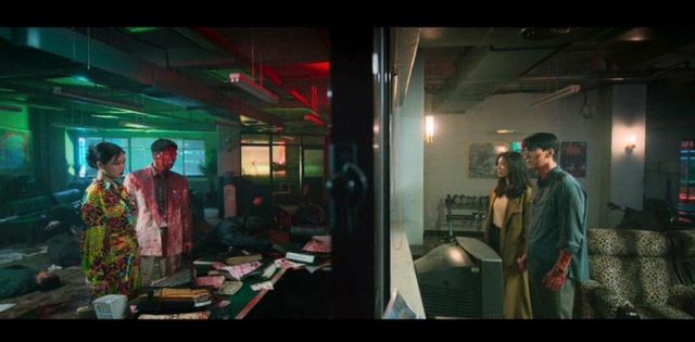 10. 單一畫面用窗框分開兩組人。企鐵的服裝顏色越來越單純(脫色)和宜貞一樣;但是