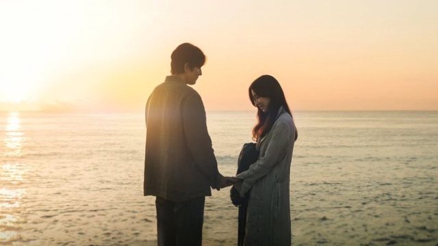 最後在一天的結束時 在被夕陽染得粉紅的海邊相遇