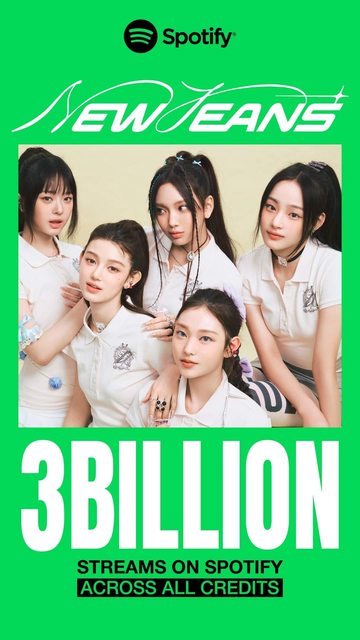 到目前爲止,NewJeans共有9首Spotify上億流量的歌曲。5億以上的'OMG' 、4億以上的'Dit