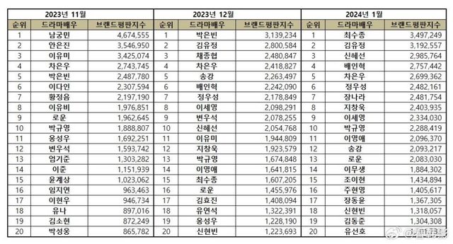 韓國企業聲譽研究所分析了2023年12月9日至2024年1月9日播出的50名電視劇演員的60,50