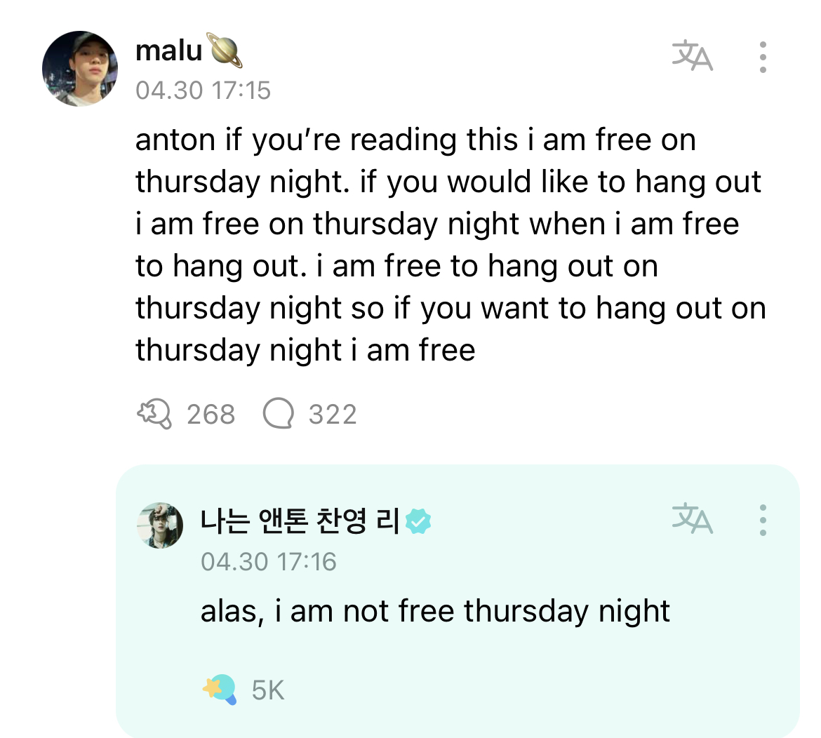 → zora9794: 昨天Anton在Weverse的回覆很好笑 213.209.99.67 05/01 15:15