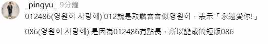 推 linkin0506: 012是永遠的的諧音,486是我愛你的筆 61.227.219.39 08/11 23:05