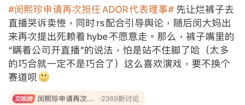 → ILNARA: 他就最純的XDDD 怎麼不想想 人家HYBE就在 203.204.70.54 09/13 13:49