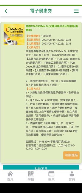 TPASS/MeN Go交通月票100元抵用券(南高屏)